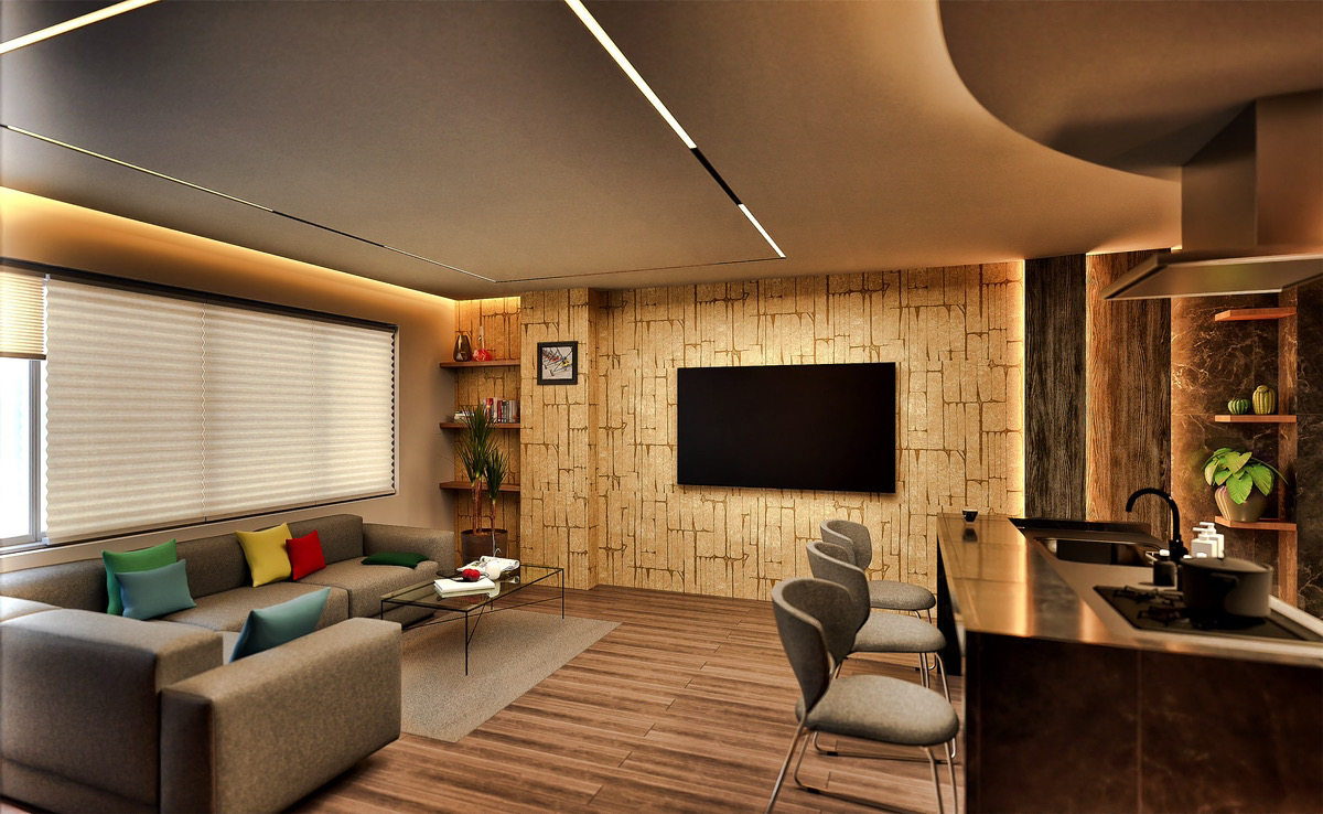 木とタイルが織りなす空間は、